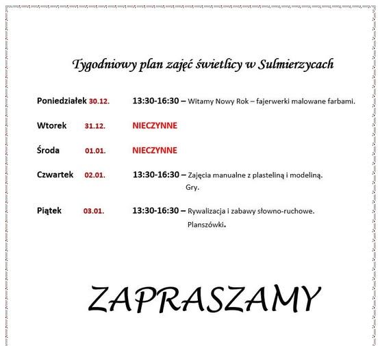 Tygodniowy plan zajęć w świetlicy Świetlica30 grudnia 2024Możliwość komentowania Tygodniowy plan zajęć w świetlicy została wyłączona Zapraszamy! Plakat.