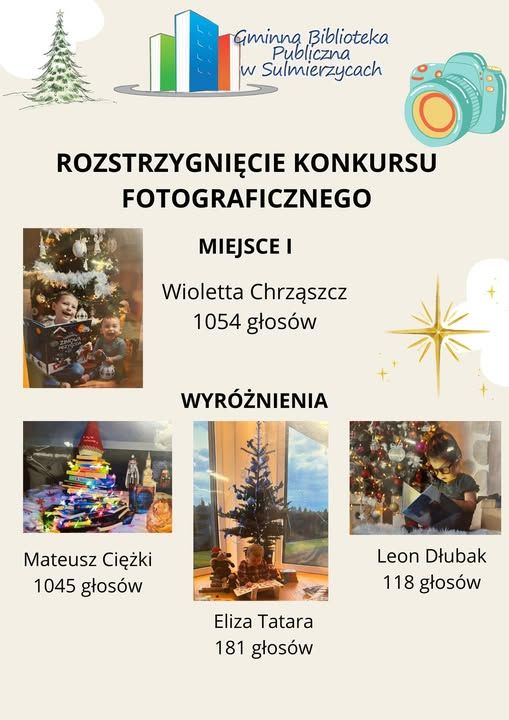 Znamy już zwycięzcę Konkursu Fotograficznego pt. „Magiczne święta z książką”. Po podsumowaniu głosów ze strony Facebook GBP w Sulmierzycach oraz głosów oddanych stacjonarnie w siedzibie biblioteki, wyłoniliśmy laureata konkursu.