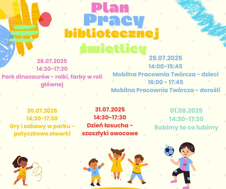 Tygodniowy plan zajęć świetlicy Świetlica25 lipca 2025Możliwość komentowania Tygodniowy plan zajęć świetlicy została wyłączona Oto tygodniowy plan zajęć bibliotecznej świetlicy. Zapraszamy! Plakat.