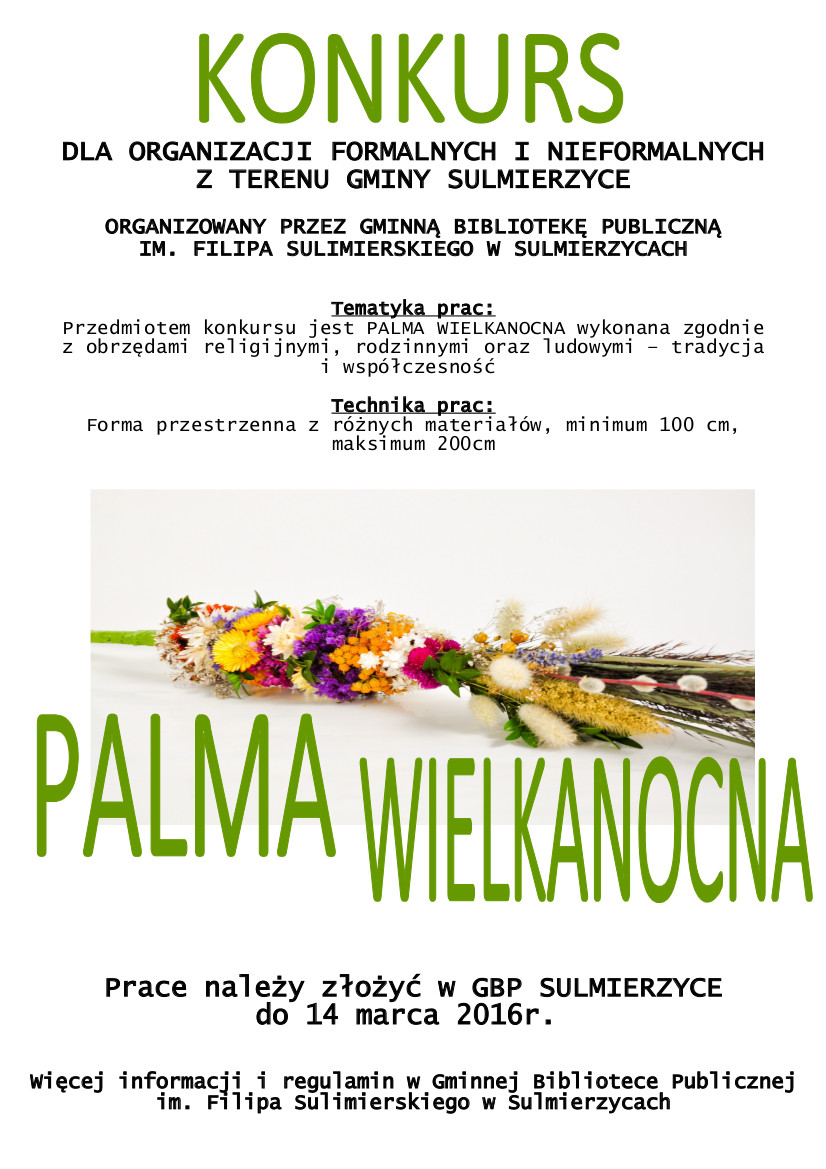 Ogłaszamy konkurs na Palmę Wielkanocną Ogłoszenia26 stycznia 2016Możliwość komentowania Ogłaszamy konkurs na Palmę Wielkanocną została wyłączona