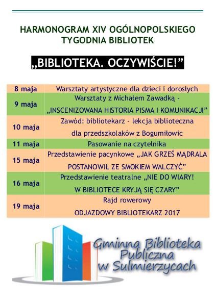 TYDZIEŃ BIBLIOTEK 2017 Ogłoszenia5 maja 2017Możliwość komentowania TYDZIEŃ BIBLIOTEK 2017 została wyłączona