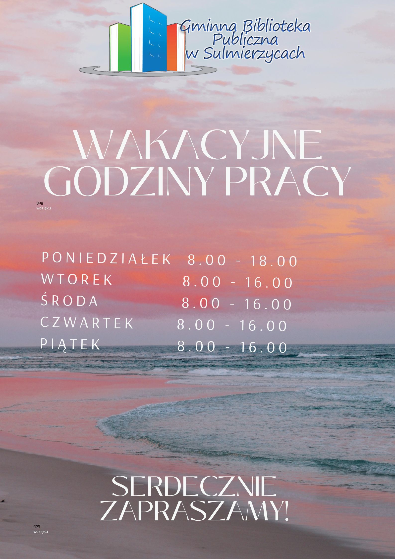 Wakacyjne godziny pracy Ogłoszenia, Strona główna1 lipca 2022Możliwość komentowania Wakacyjne godziny pracy została wyłączona Kochani czytelnicy! Oto wakacyjne godziny pracy naszej biblioteki. Zapraszamy! Plakat z napisem wakacyjne godziny pracy.