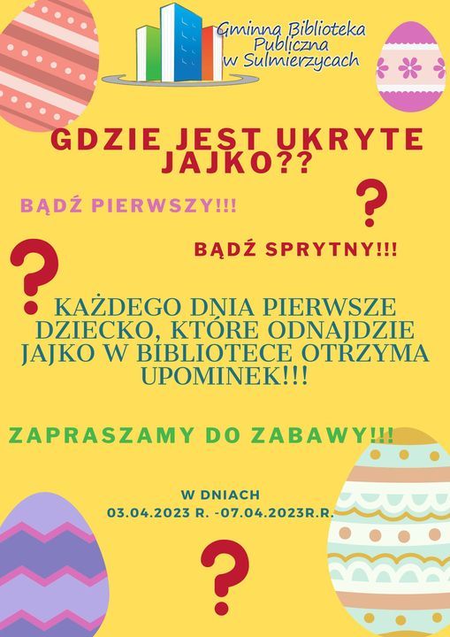 Serdecznie zapraszamy od poniedziałku wszystkie dzieci do wzięcia udziału w zabawie wielkanocnej! Kto pierwszy ten lepszy! Oczywiście nie zapomnijcie wypożyczyć książki!