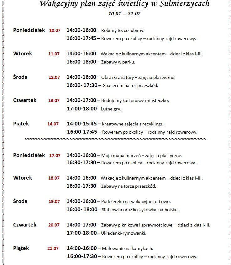 Wakacyjny plan zajęć świetlicy od 10. 07. 2023 r. do 21. 07. 2023 r. Ogłoszenia, Świetlica7 lipca 2023Możliwość komentowania Wakacyjny plan zajęć świetlicy od 10. 07. 2023 r. do 21. 07. 2023 r. została wyłączona Zapraszamy! Plakat.