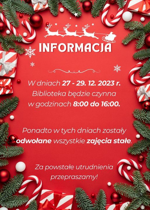 Godziny pracy biblioteki w okresie świątecznym Ogłoszenia22 grudnia 2023Możliwość komentowania Godziny pracy biblioteki w okresie świątecznym została wyłączona Uwaga! Plakat.