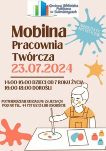 Zapisy na wakacyjne zajęcia w ramach Mobilnej Pracowni Twórczej Ogłoszenia19 lipca 2024Możliwość komentowania Zapisy na wakacyjne zajęcia w ramach Mobilnej Pracowni Twórczej została wyłączona Kochani Czytelnicy! Przypominamy o potwierdzeniu udziału w wakacyjnych zajęciach w ramach Mobilnej Pracowni Twórczej. Plakat.