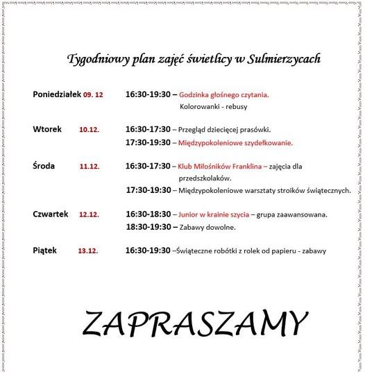 Plan pracy świetlicy na najbliższy tydzień Świetlica6 grudnia 2024Możliwość komentowania Plan pracy świetlicy na najbliższy tydzień została wyłączona Serdecznie zapraszamy! Plakat.