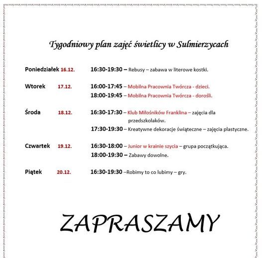 Plan pracy świetlicy na najbliższy tydzień Świetlica19 grudnia 2024Możliwość komentowania Plan pracy świetlicy na najbliższy tydzień została wyłączona Serdecznie zapraszamy! Plakat.