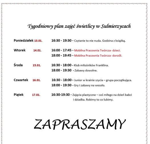 Plan pracy świetlicy na najbliższy tydzień Świetlica10 stycznia 2025Możliwość komentowania Plan pracy świetlicy na najbliższy tydzień została wyłączona Serdecznie zapraszamy!
