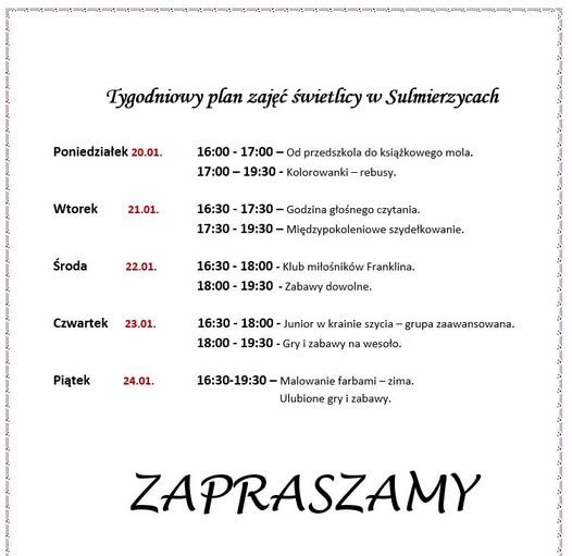Tygodniowy plan zajęć świetlicy na najbliższy tydzień Świetlica17 stycznia 2025Możliwość komentowania Tygodniowy plan zajęć świetlicy na najbliższy tydzień została wyłączona Serdecznie zapraszamy do udziału w zajęciach.