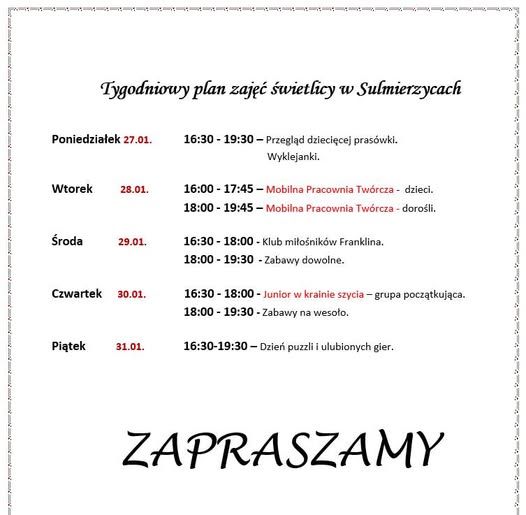 Zapraszamy na kolejny tydzień zajęć bibliotecznej świetlicy Świetlica24 stycznia 2025Możliwość komentowania Zapraszamy na kolejny tydzień zajęć bibliotecznej świetlicy została wyłączona Zapraszamy na kolejny tydzień zajęć bibliotecznej świetlicy. Plakat.