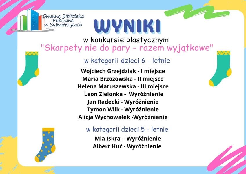 Wyniki w konkursie „Skarpetka nie do pary” Strona główna21 marca 2025Możliwość komentowania Wyniki w konkursie „Skarpetka nie do pary” została wyłączona Dzielimy się z Wami wynikami konkursu plastycznego. Dziękujemy wszystkim uczestnikom, a zwycięzcom serdecznie gratulujemy! Plakat.