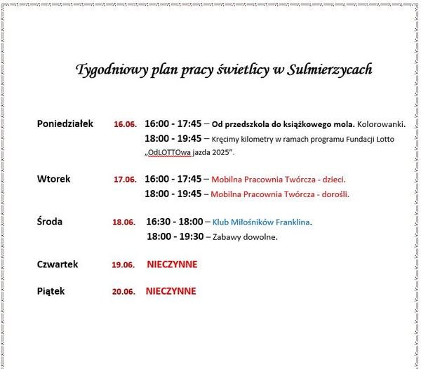 Tygodniowy plan pracy świetlicy Świetlica13 czerwca 2025Możliwość komentowania Tygodniowy plan pracy świetlicy została wyłączona Serdecznie zapraszamy! Plakat.