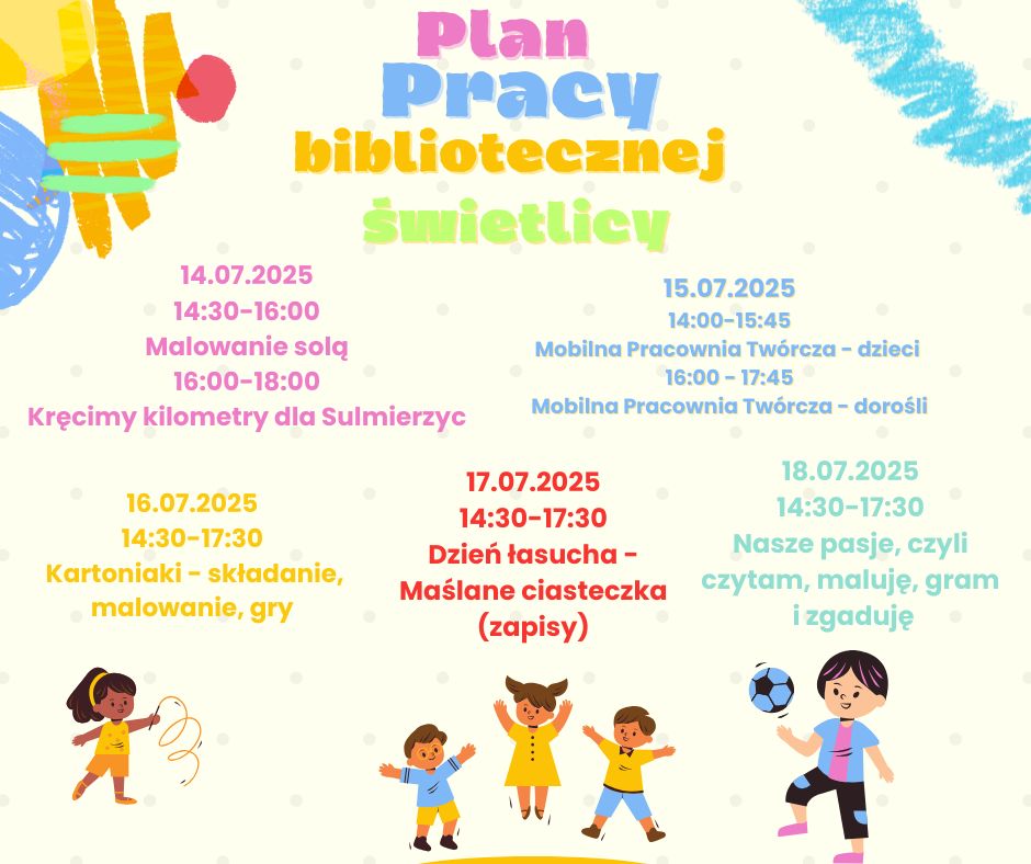Tygodniowy plan pracy świetlicy Świetlica11 lipca 2025Możliwość komentowania Tygodniowy plan pracy świetlicy została wyłączona Serdecznie zapraszamy na zajęcia do bibliotecznej świetlicy! Oto plan pracy na najbliższy tydzień! Plakat.