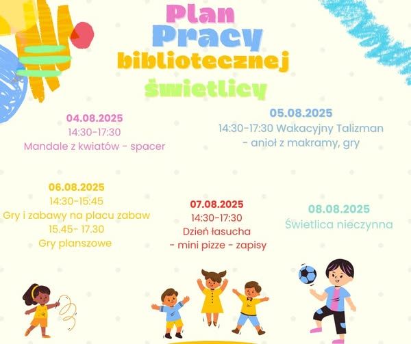 Plan pracy świetlicy na najbliższy tydzień Świetlica4 sierpnia 2025Możliwość komentowania Plan pracy świetlicy na najbliższy tydzień została wyłączona Zapraszamy! Plakat.