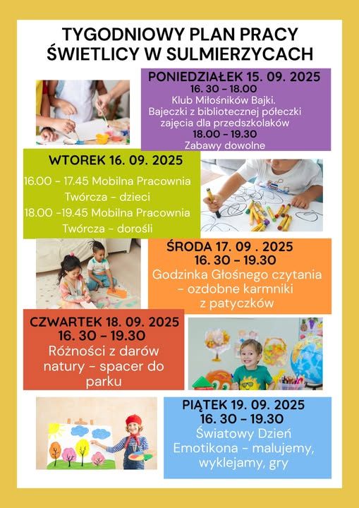 Tygodniowy plan pracy świetlicy Świetlica12 września 2025Możliwość komentowania Tygodniowy plan pracy świetlicy została wyłączona Serdecznie zapraszamy do udziału w zajęciach! Plakat.