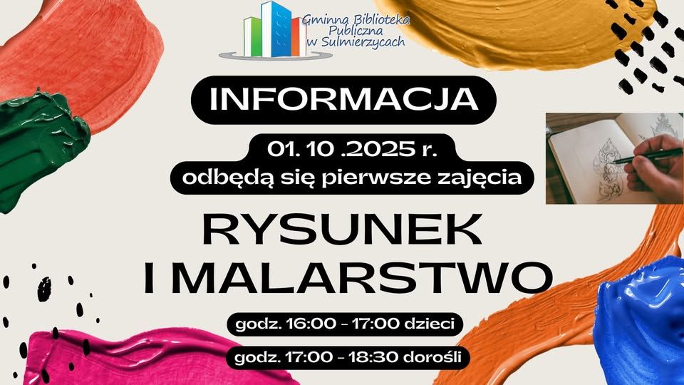 Rysunek i malarstwo – informacja Ogłoszenia23 września 2025Możliwość komentowania Rysunek i malarstwo – informacja została wyłączona Uwaga! Uwaga! Mamy dobre wiadomości dla wszystkich osób, które z niecierpliwością czekają na pierwsze zajęcia rysunku i malarstwa. Plakat.