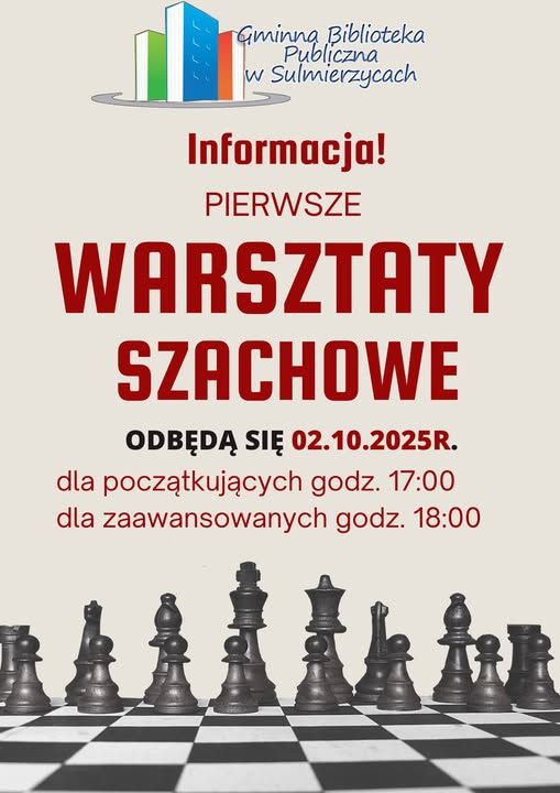 Warsztaty szachowe – informacja Ogłoszenia23 września 2025Możliwość komentowania Warsztaty szachowe – informacja została wyłączona Uwaga! Już 02.10.2025 r. odbędą się pierwsze warsztaty szachowe. Zapraszamy! Plakat.