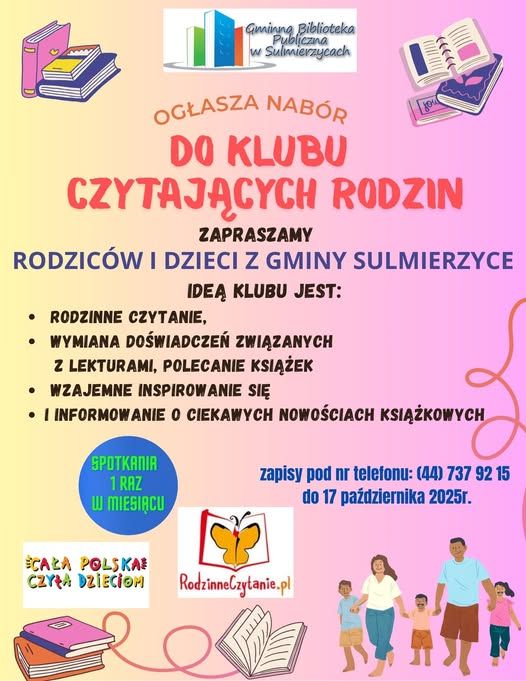 Dołącz do Klubu Czytających Rodzin Ogłoszenia, Strona główna1 października 2025Możliwość komentowania Dołącz do Klubu Czytających Rodzin została wyłączona LUB CZYTAJĄCYCH RODZIN…kto ma ochotę się zapisać??? Czekamy na Wasze zgłoszenia. Plakat.