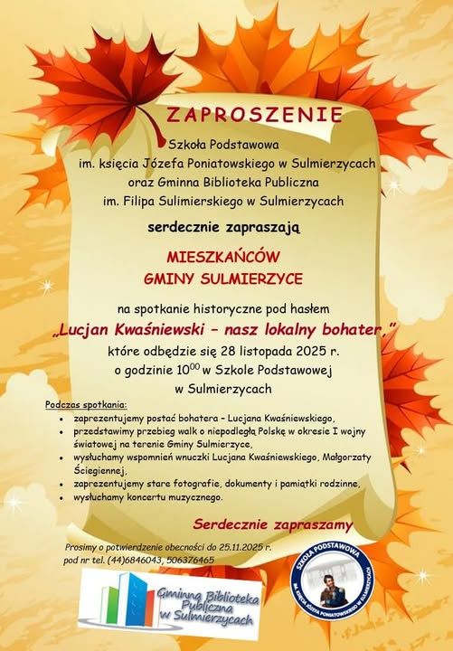 Zaproszenie na spotkanie historyczne Ogłoszenia, Strona główna5 listopada 2025Możliwość komentowania Zaproszenie na spotkanie historyczne została wyłączona Serdecznie zapraszamy! Plakat.