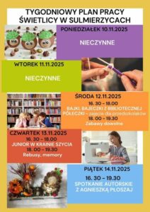 Tygodniowy plan pracy świetlicy Świetlica7 listopada 2025Możliwość komentowania Tygodniowy plan pracy świetlicy została wyłączona Zapraszamy! Plakat.