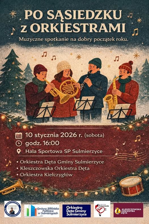 Gminna Biblioteka Publiczna im. Filipa Sulimierskiego w Sulmierzycach, Szkoła Podstawowa im. księcia Józefa Poniatowskiego w Sulmierzycach oraz Orkiestra Gminy Sulmierzyce serdecznie zapraszają wszystkich mieszkańców oraz sympatyków orkiestr dętych na noworoczny koncert „Po sąsiedzku”, który odbędzie się 10 stycznia 2026r. w hali SP w Sulmierzycach.