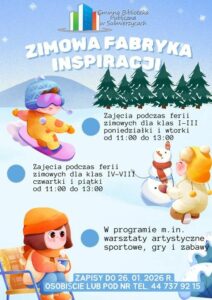 Zapisy na zajęcia podczas ferii ziomowych Ogłoszenia, Strona główna12 stycznia 2026Możliwość komentowania Zapisy na zajęcia podczas ferii ziomowych została wyłączona Czas zaplanować ferie zimowe… Serdecznie zapraszamy na zajęcia, które będą się odbywać w naszej bibliotece. Zapisy trwają do 26.01.2026 r. Liczba miejsc ograniczona. Plakat.