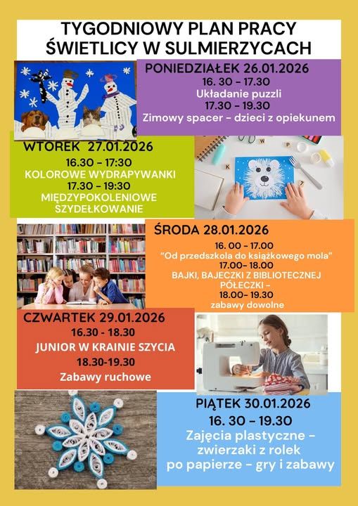 Tygodniowy plan pracy świetlicy Świetlica23 stycznia 2026Możliwość komentowania Tygodniowy plan pracy świetlicy została wyłączona Serdecznie zapraszamy do udziału w zajęciach! Plakat.