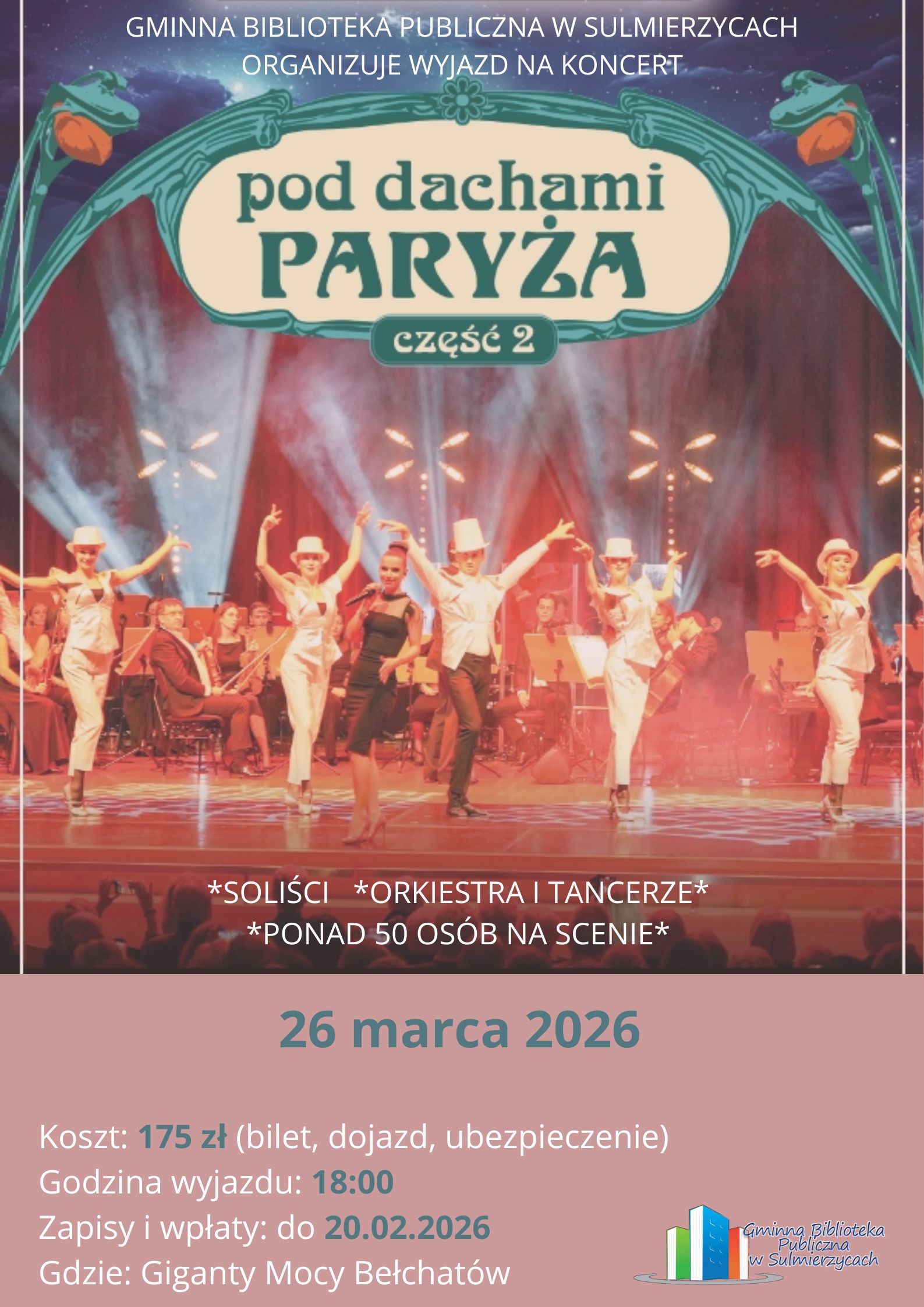 W odpowiedzi na liczne zapytania organizujemy wyjazd na koncert „Pod dachami Paryża 2”, który odbędzie się 26 marca. Więcej szczegółów na plakacie, w bibliotece lub pod numerem telefonu 44 737 92 15. Zapraszamy do zapisów!