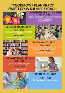 Tygodniowy plan pracy świetlicy Świetlica27 lutego 2026Możliwość komentowania Tygodniowy plan pracy świetlicy została wyłączona Zapraszamy! Plakat.