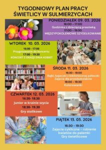 Tygodniowy plan pracy świetlicy Świetlica6 marca 2026Możliwość komentowania Tygodniowy plan pracy świetlicy została wyłączona Serdecznie zapraszamy na zajęcia! Plakat.