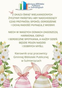 Życzenia wielkanocne dla naszych Czytelników Strona główna3 kwietnia 2026Możliwość komentowania Życzenia wielkanocne dla naszych Czytelników została wyłączona Kochani Czytelnicy! Przyjmijcie najserdeczniejsze życzenia z okazji Świąt Wielkiej Nocy od całego zespołu Gminnej Biblioteki Publicznej w Sulmierzycach. Kartka z życzeniami wielkanocnymi.