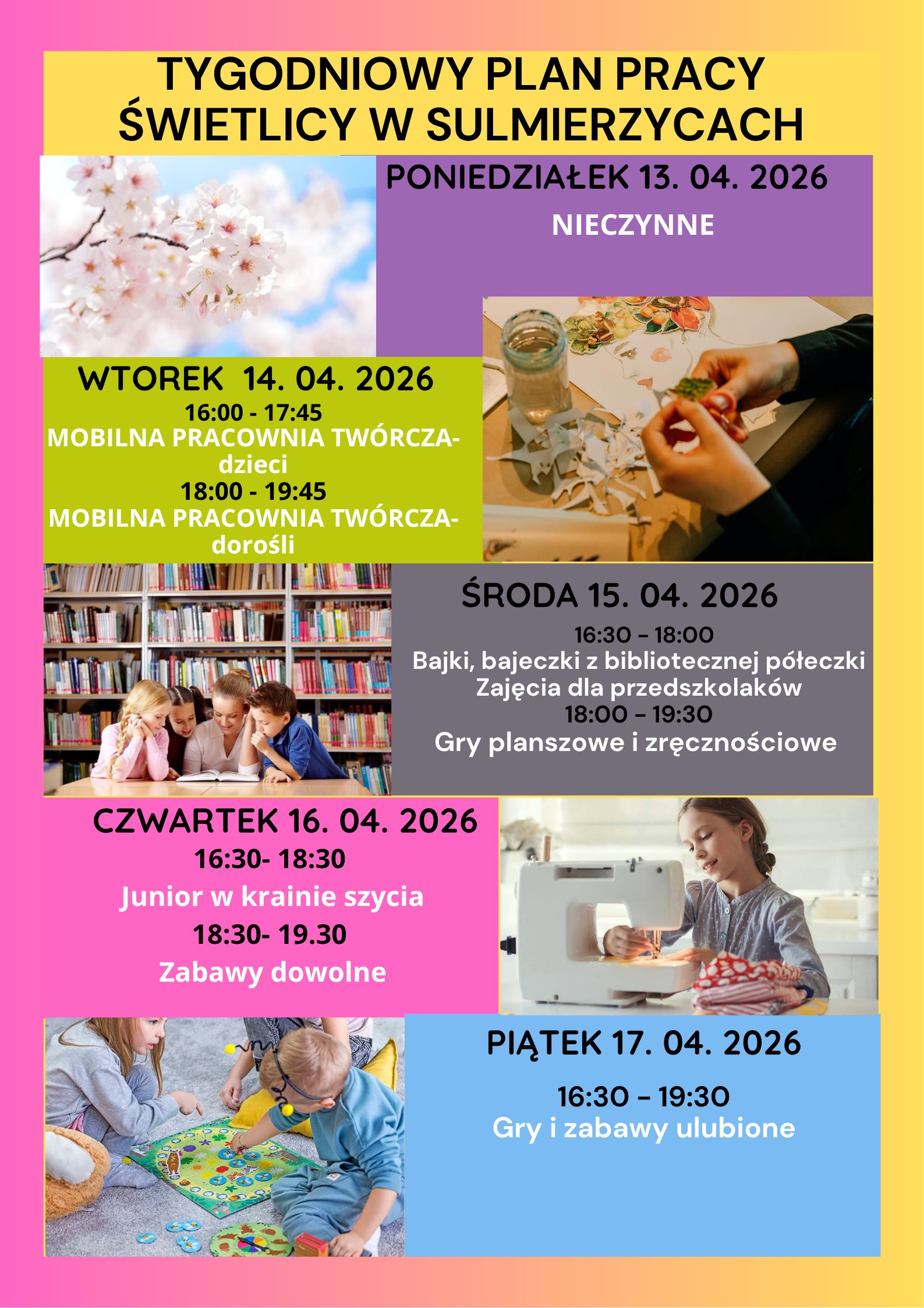 Plan pracy bibliotecznej świetlicy Świetlica10 kwietnia 2026Możliwość komentowania Plan pracy bibliotecznej świetlicy została wyłączona Oto plan zajęć bibliotecznej świetlicy na kolejny tydzień. Serdecznie zapraszamy! Plakat.