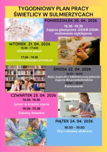 Tygodniowy plan pracy świetlicy Świetlica17 kwietnia 2026Możliwość komentowania Tygodniowy plan pracy świetlicy została wyłączona Serdecznie zapraszamy! Plakat.