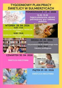 Tygodniowy plan pracy świetlicy Świetlica24 kwietnia 2026Możliwość komentowania Tygodniowy plan pracy świetlicy została wyłączona Zapraszamy! Plakat.